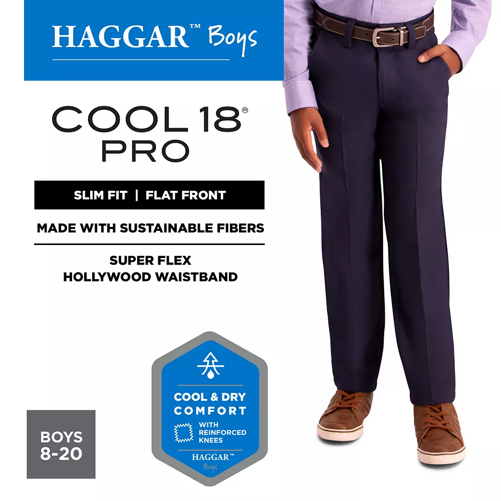 He’ll love the handsome style and ultimate comfort of these Boys’ Haggar Cool 18 Pro Boys Slim Fit Pants.