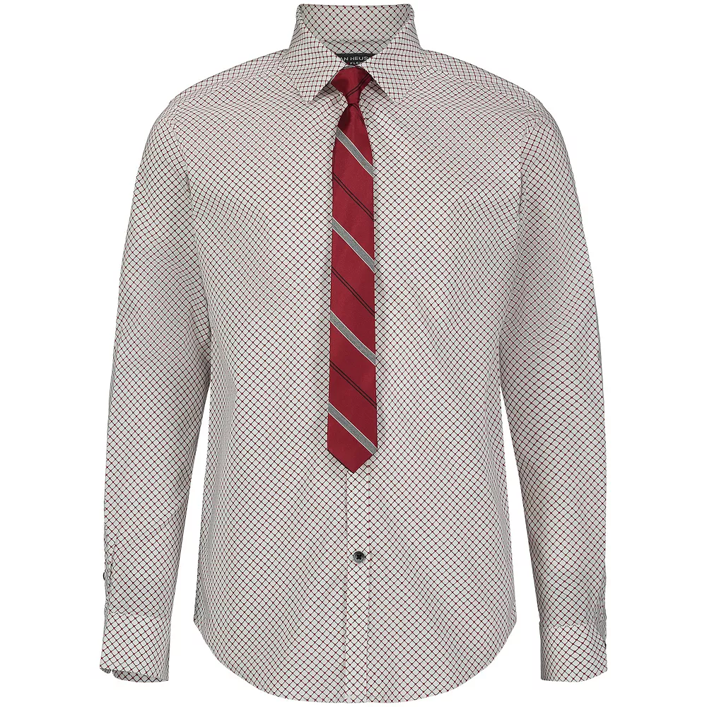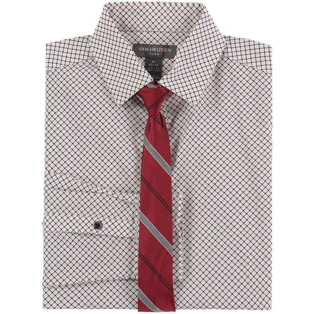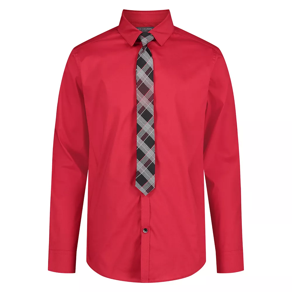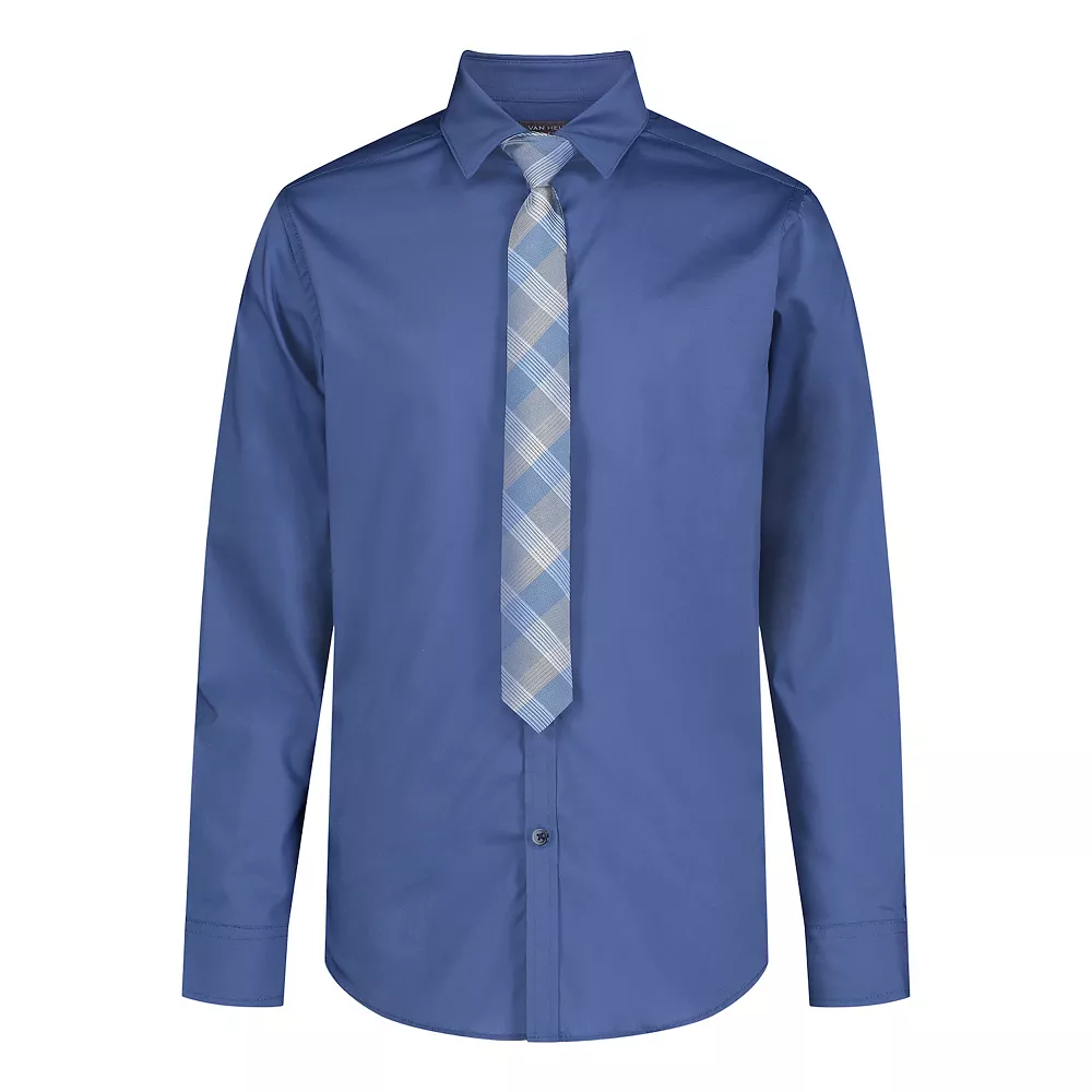 He’ll look as handsome as can be wearing this boys’ button-up shirt and coordinating tie from Van Heusen.